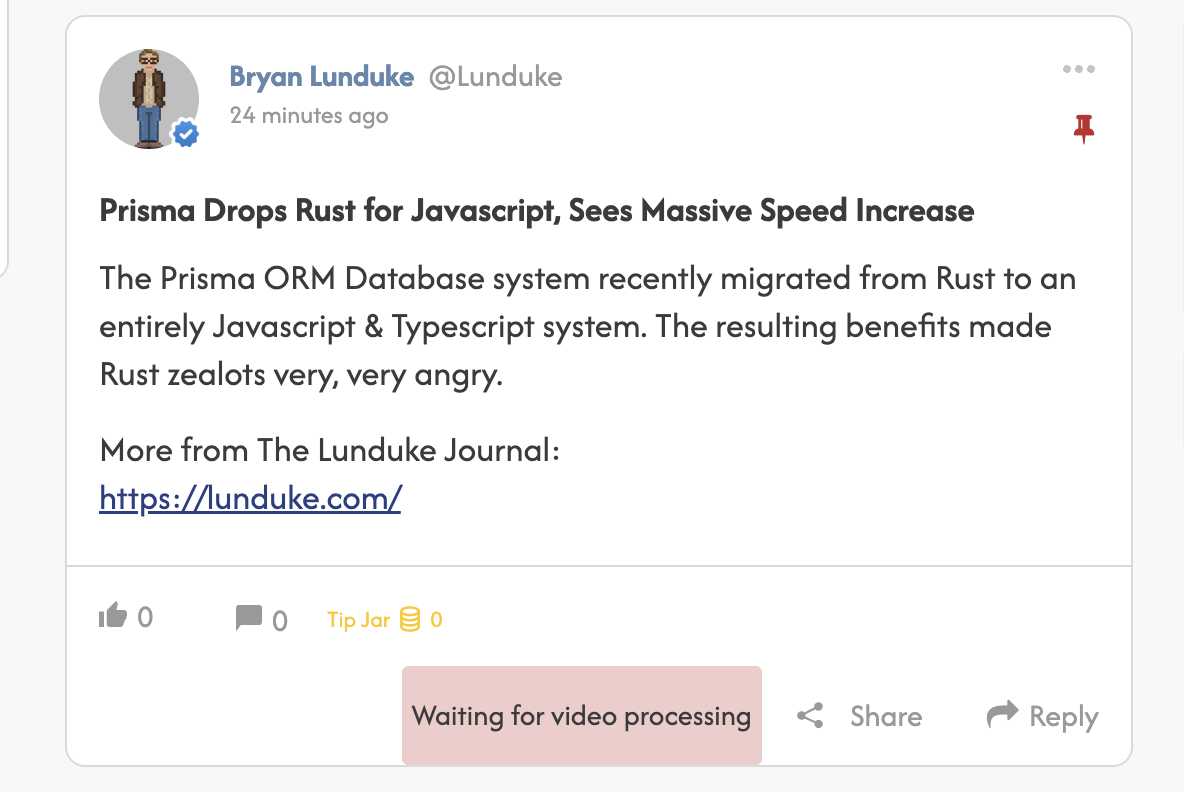Video stuck in the "Processing" stage here on Locals. Again. This has been happening a lot lately.