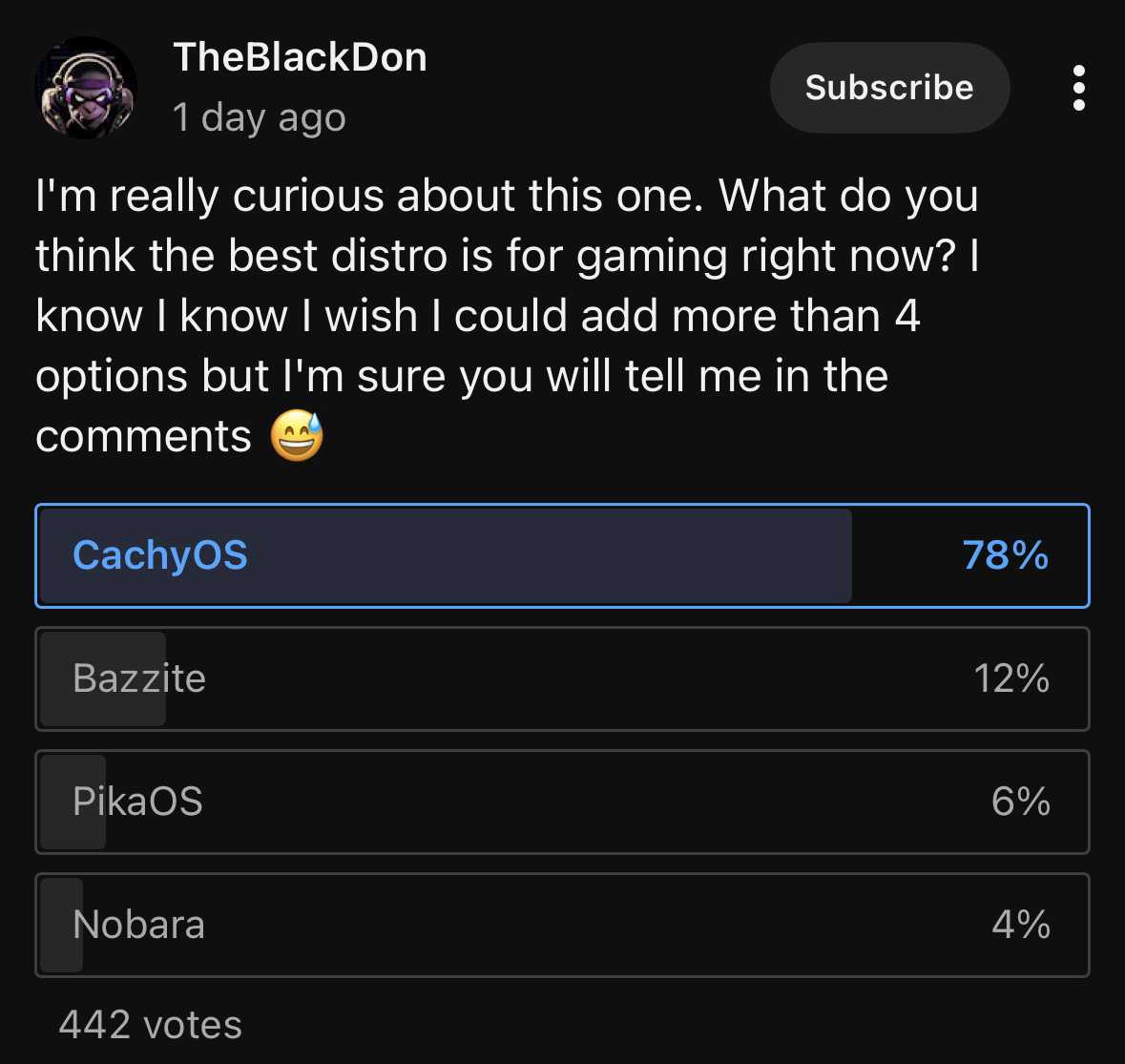 This poll will definitely have a stronger bias to the nerdier Linux crowd, but it is interesting to see that the overwhelming majority prefers cachyos for gaming in this poll (myself included)