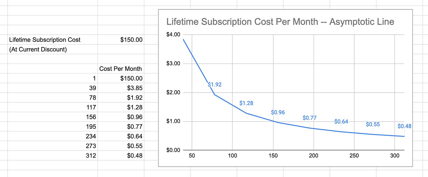 Every day that passes, the value of that Lifetime Subscription gets better and better. Like any good asymptotic line, it steadily approaches 0 (but never quite gets there).