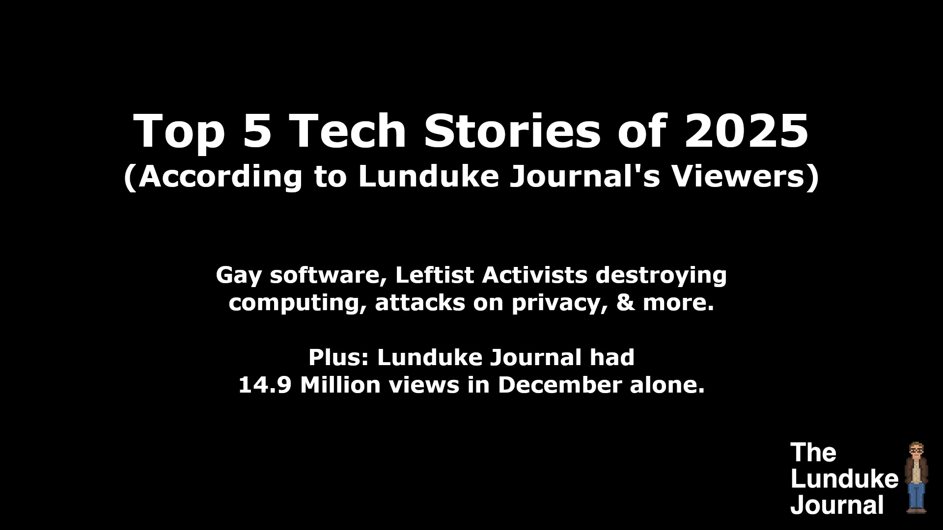 Gay software, Leftist Activists destroying computing, attacks on privacy, & more. Plus: Lunduke Journal had 14.9 Million views in December alone.
